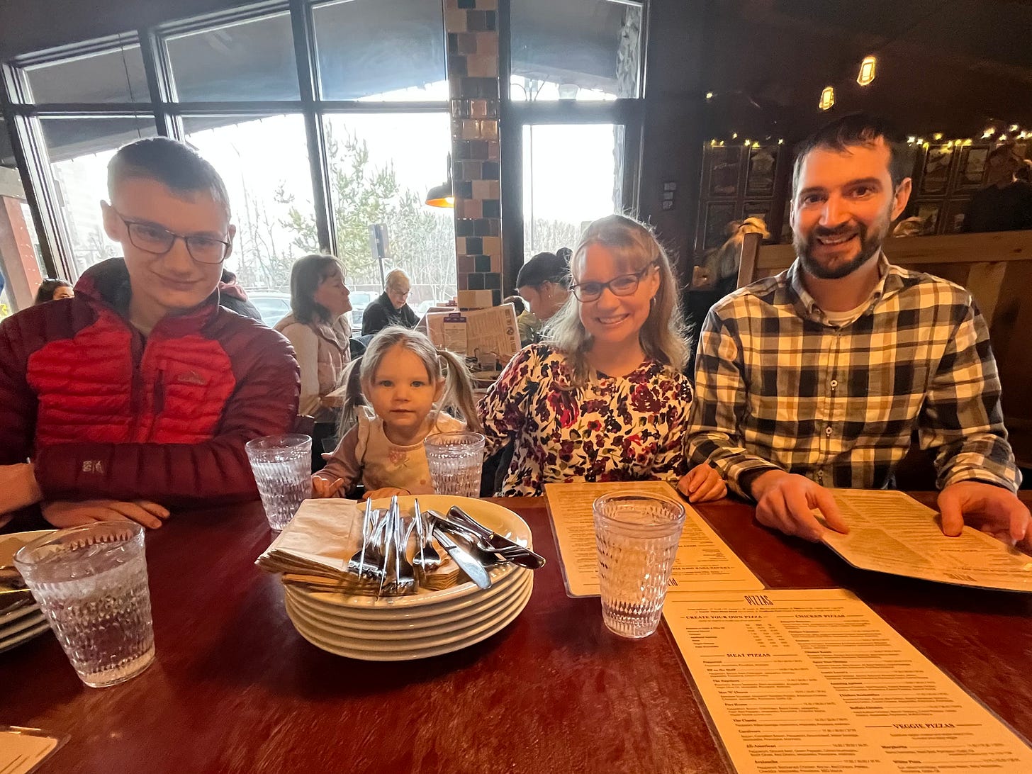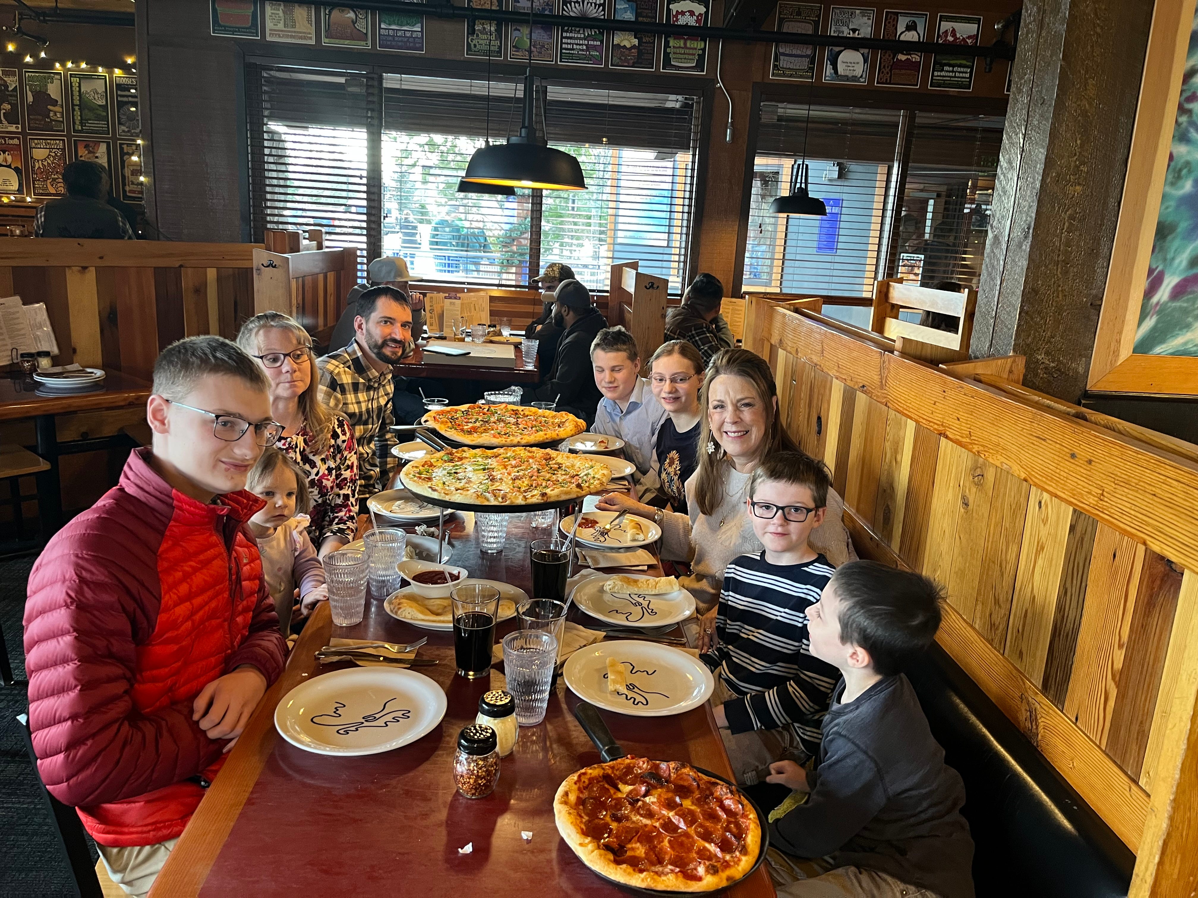 Very unusually, as God does, Daniel found a beautiful, sweet woman, Sharon, whose husband had also committed suicide. Sharon was left with three children. Daniel and Sharon are now married and have a combined family of six—Ryan, Emily, Levi, Enoch, Ethan, and now a little girl of their own, Lydia. Sharon lovingly homeschools her children. I got to have a fun pizza lunch with this new and happy family. God is good. To God be the glory, great things He has done.